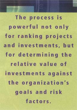 Implementing TeamEC In looking for a solution that would accomplish these tasks, the VA came across Expert Choice, a firm that offers a group-enabled software version of the AHP. Team Expert Choice, or TeamEC, is a software solution that is equipped with keypads for multiple voters. In the interim, VA established the CIB and a Capital Investment Panel to review all capital investments. These VA decision makers (representing the various stakeholder groups within the agency) were gathered and presented with a keypad. Decision makers were walked through a set of pairwise comparisons where they were asked to compare goals for their relative importance to the VA. For example, executives were asked to compare "return on investment" (ROI) to "improving customer service" to determine which contributed more to the success of the organization. Voters were then asked to discuss their positions with others. They shared what they did and did not know and their stakeholder priorities. After discussing the priorities, voters were permitted to change their votes. Subsequently, they were asked to compare ROI to "Risk" and then Risk to customer service. The software calculated the votes' geometric average for each comparison, then the averages were used to compute the AHP priorities. The AHP algorithm places the ratios of each pair of factors' relative importance into a matrix. This matrix is then multiplied by itself and the eigenvector, or priority of the goals at a given level of hierarchy, is computed. The weighted goals were then used to rate investment options for their contributions to improving performance in the VA. In addition to providing consensus, the process also had a positive impact on the group's dynamics. For the first time, senior executives left a planning meeting in consensus about what was important to the organization and how the investments would enable the VA to achieve the strategic goals. The decision model was delivered to the project evaluation team on a laptop with radio frequency keypads to enable the team to efficiently rate each project against the objectives to which it contributed. The software allowed decision makers to use both quantitative and qualitative information to rate competing investments. For intangible objectives like improving customer service, it provided the capability to build adjectival scales such as outstanding, very good, good, and so forth. The ratings are weighted and based on the value that decision makers perceive for each rating. If numerical performance data is available, the raw data is converted to a utility score between 0 and 1, with 1 being the highest possible data point. Evaluators can then build a utility curve to determine the value of any data point in the range. VA evaluators entered ratings using thekeypads, then were given the opportunity to discuss their scores. One of the ground rules was that ratings had to be sufficiently close to move to the next judgment. Once the ratings had been applied to the projects the software produced a final priority list justifying the incremental strategic benefits of each project.