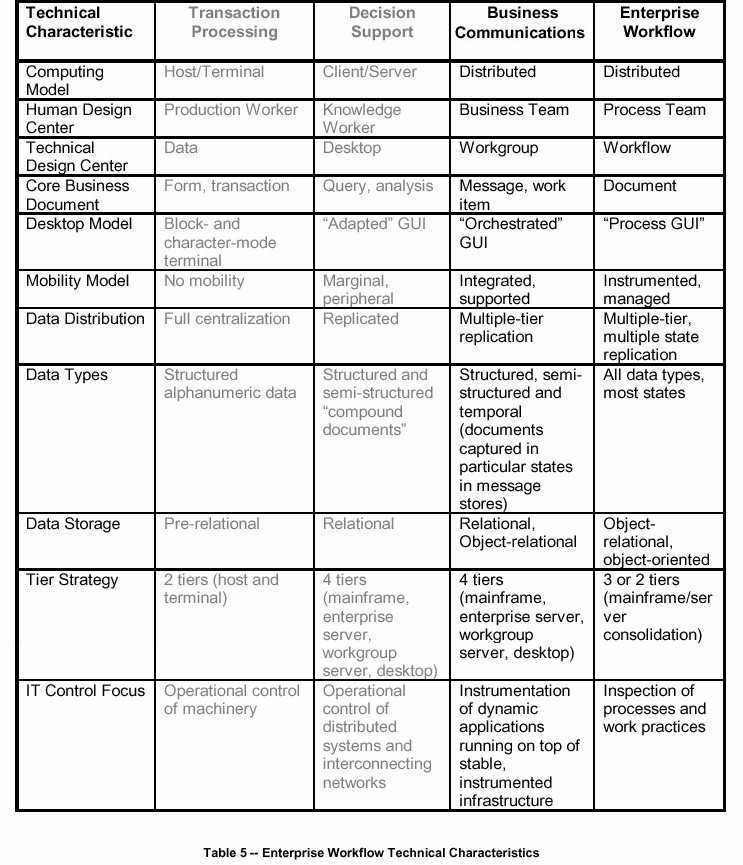 The shifts at the transition points are instructive, most importantly because they tell us something about the future: the next sets of transitions we will encounter. ![]() Transition point 1 was essentially the decision to use IT to deskill and routinize production work. This was a fairly conventional transition, and did not fundamentally disrupt the firm’s culture or organization, since in most cases this production work was already culturally devalued by the firm. The essential drivers for this change were (a) the availability of a solid-state-based technology that promised to do for the “white collar factory” what mechanical and electro-mechanical technology had done for the shop floor, and (b) compelling existence proofs of the cost-reduction and cycle-time benefits of IT applied in this fashion (the accountancy function). Transition 2 was significantly more disruptive. The fundamental decision was to open the data vaults and turn data over to the people who actually made the salient business decisions for the firm. The change was heralded, if not catalyzed, by two important drivers: the personal computer, and the design center for the personal computer, the knowledge worker. In the same way that a previous generation of white collar workers depended on calculators, typewriters and telephones to do their work, knowledge workers after 1988 or so were dependent on the availability of personal computers, and personal productivity tools (most particularly the spreadsheet and the word processor) to produce their intellectual property. But Transition 2 did not disrupt some of the fundamental assumptions of Transition 1: specifically, the focus of IT was still the orchestration of the tasks of individuals. The individual changed -- from a production worker to a knowledge worker -- and the type of task changed: from making and moving things, from data entry associated with making and moving things, to taking and making decisions. And, if the guild of knowledge work had not been one in which the inspection and rationalization of work processes violated the fundamental unspoken contract between the knowledge worker and the firm, I believe we might have tried to routinize and automate that class of task as well. It is Transition 3 that finally breaks the orchestration model that focuses on individuals and tasks. Driven in this case by (a) process-oriented management disciplines like TQM and BPR and (b) the attendant cultural emphasis on teaming, connectedness and asynchronous work, Transition 3 breaks open the whole concept of IT-as-orchestration by focusing IT on connecting collaborators, not on managing the output (in the case of OLTP) or the input (in the case of DSS) of the tasks of individuals. Transition 3 creates an infrastructure that is nearly purely facilitative. Everyone is connected to everyone else, and what passes along those electronic connections is, by the time Transition 3 is complete, inscrutable to the firm: outside the pale of IT. And that -- the idea that the firm provides facilitative technology for the production of knowledge from information from data, but cannot scrutinize either the work product or the means of production -- quickly becomes untenable for strategically-minded firms aware that their competitive advantage derives from their process innovation and their intellectual property. Transcending the Triad: Enterprise WorkflowIn other words, the model implies some cyclicality. Once we have ‘completed’ the business communications regime, we are right back where we started, at the fundamental question IT was brought into the firm to address: how to make rational, inspectable and more efficient the work of employees, and thereby increase the production of economic value for the firm, its customers and its owners. There is, it appears, a fourth transition point. But what is it? We refer to this transition as the transition to enterprise workflow: to the use of the infrastructure created by the triad to create a set of enterprise-wide applications that embody process logic, expose knowledge work to scrutiny and instrumentation, and explicitly orchestrate the tasks inside the firm’s components of the value chain. Enterprise workflow is the management of commitments: within the firm, between the firm and suppliers, between the firm and channel partners, between the firm and customers. Enterprise workflow cannot come into existence until the Triad is complete and functional. ![]() We have talked elsewhere about the strategic dilemma inherent in enterprise workflow -- the empowerment versus control paradigm that requires us to ask ourselves whether the firm ought -- from an ethical perspective -- to use workflow as a deskilling or a liberating technology model. Drucker’s typology of knowledge work is illustrative in this regard. ![]() What Drucker argues, in this analogy, is that highly-innovative business teams’ processes need to be scored and handed down to progressively more closely-managed teams as the value inherent in the process or its output decreases. Implicit in his model is the notion that such a “devolution” (supported by technology) is fundamentally enabling, since:
