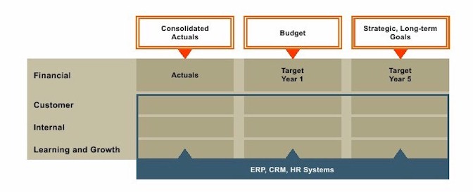 Dashboards are also evolutionary—taking a financial executive from a simple view of actuals versus budget to a link into a strategy management system that supports alignment and execution. For more on this topic, see the section entitled “Stragegy Management To Complement BI Implementations.” While dashboards are highly customizable tools, scorecards take a more structured approach. Scorecards systematically funnel and synthesize the vast quantities of dynamic enterprise activity-generated data into manageable amounts of clear, actionable insights, based on pre-defined management methodologies (Balanced Scorecard, Economic Value-Add, Six Sigma, etc.). They represent the center point of a strategy management system. Scorecards provide a visual grouping of KPIs relevant to individuals, departments, business units, or strategic objectives, focusing on future, strategic business goals. These indicators are related to the different priorities that the organization is focusing on, for example, financial, operational, customer, or quality. From the data perspective, scorecards align metric actuals with short-term and long-term goals. They can also incorporate company and industry performance benchmarks and risk factors. ![]() Figure 1. Building a scorecard As an example, a scorecard can be based on the Balanced Scorecard ® framework with the pre-defined perspectives: financial, customer, internal, and learning and growth (see Figure 1). The metrics on this scorecard are tied to a particular business unit, department, individual, or strategic objective. Having an owner for the scorecard ensures accountability, and having goals and benchmarks supports on-time delivery. This visual grouping of measures that represents a scorecard is the mechanism to communicate the organization’s goals and monitor performance. The scorecard allows a user to easily and pro-actively answer the question: “How does my goal support the corporate strategy?” It also ties into a process where each of the measures can trigger an e-mail alert when results are not in the expected range or when actions or initiatives are overdue, all in a collaborative environment supported by notes and discussion forums. Therefore, scorecards can be characterized as: