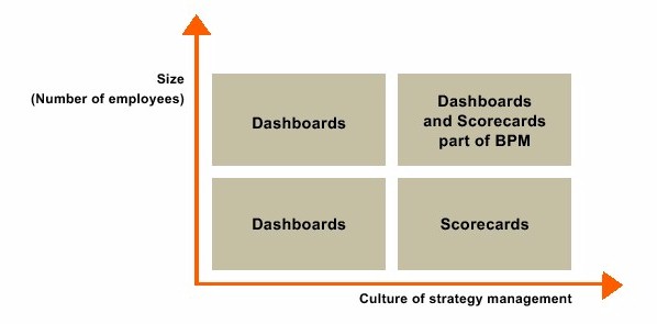 There are organizations with a culture of strategy management, and these organizations simply need an enabler for their process. The strategy management process can be sustained by strategy management applications that help users articulate the strategy and goals, communicate these across the enterprise, and monitor key performance indicators using recognized scorecarding methodologies and industry benchmarks. The software must offer complete strategy - and accountability- mapping capabilities, as well as Web-based scorecards, message boards, forums, and discussion threads. “A strategic plan is the beginning, not the end, of a never-ending growth cycle. It’s a blueprint for action that should influence every action of every person in your organization every day.” Execute the strategic plan or get the boot, Reality of Growth Guide No. 1, Deloitte Touche Tohmatsu, 2004. 3. Repeatable Process - How can executives ensure that all business units are aligned? How can they ensure continuity and strategy execution? Large organizations with thousands of employees can not continue using the traditional management practices. They must adapt their practices to current market and competitive pressures. These organizations spend a considerable amount of time communicating the strategy and aligning corporate vision and goals to daily actions and initiatives. Today, a BPM software solution integrates business and financial management applications with broad reporting and analysis functionality. With an integrated solution, users can ensure that the deliverables in the organization are aligned, the budgets are tied to the strategic and operational goals, and information is available to all decision makers with a unified point of view through dashboards and scorecards. For an integrated solution, users will define the strategy, tie it to the planning and budgeting cycle, refine the targets, and create scorecards based on actuals and forecasts. All the real-time data will be consolidated into a user-defined view as part of a dashboard (see Figure 3). ![]() Figure 3. Hyperion’s BPM solution architecture Ultimately tying the strategy management system to an established dashboarding solution will give users the benefits of having real-time business data, as well as strategic performance results in a comprehensive, easy-to-use interface. As organizations evolve, their software requirements progress as well. From the three categories described earlier, we have seen organizations evolve from an initial dashboarding solution to a combined implementation, including dashboards and scorecards (see Figure 4). ![]() Figure 4. Dashboards and scorecard usage based on company size and strategy/change management culture There are many options for implementing a BPM solution. The following typical approaches impact dashboards and scorecards: